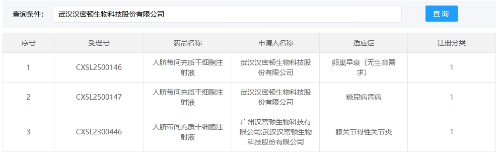 新增受理5:2025年02月15號,武漢漢密頓生物科技股份有限公司的人臍帶間充質干細胞注射液”的臨床試驗申請獲受理(受理號:CXSL2500146)。適應癥:卵巢早衰(無生育需求)。