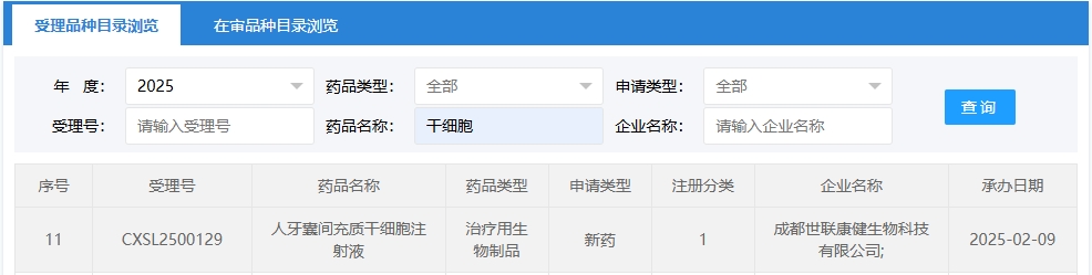 新增受理4:2025年02月09號,成都世聯康健生物科技有限公司的人牙囊間充質干細胞注射液的臨床試驗申請獲受理(受理號:CXSL2500129)。這是該款細胞注射液第2次獲得受理。