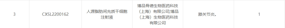 新增受理2:2025年1月25日,博品骨德(深圳)生物醫藥科技有限公司;博品(上海)生物醫藥科技有限公司的人源脂肪間充質干細胞注射液的臨床試驗申請獲受理(受理號:CXSL2200162),這是該款細胞注射液第1次獲得受理,適應癥:膝關節炎。