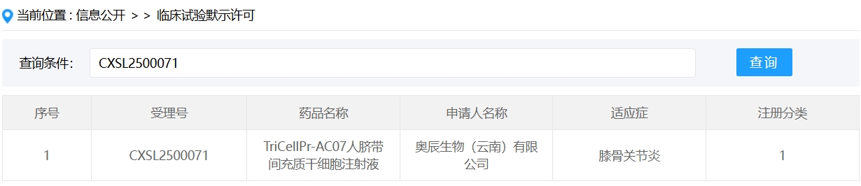 新增受理1:2025年1月23日,奧辰生物(云南)有限公司申報的 “TriCellPr-AC07人臍帶間充質干細胞注射液” 臨床試驗申請首次獲受理(受理號:CXSL2500071),適應癥:膝骨關節炎。