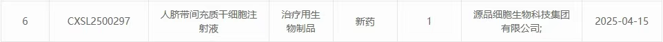 新增受理9:2025年04月15號,源品細胞生物科技集團有限公司的人臍帶間充質干細胞注射液的臨床試驗申請獲受理(受理號:CXSL2500297)。這是該款細胞注射液1獲得受理。