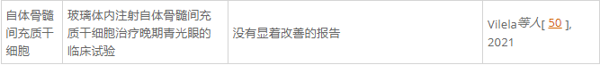 迄今為止,在臨床試驗(yàn)中沒有描述任何顯著影響。在晚期青光眼患者中,玻璃體內(nèi)注射自體BMSCs并未引起視力或視野的明顯改善。