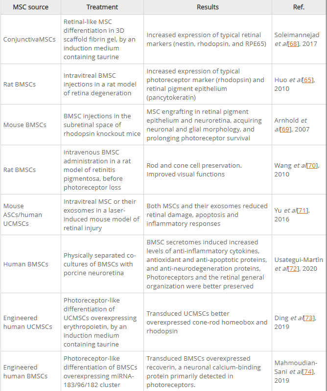 在基于MSC的治療后獲得的結(jié)果總結(jié)在表2中。它們中的大多數(shù)表明RGC存活率提高、功能性RGC樣細(xì)胞的產(chǎn)生以及成熟RGC中常駐視網(wǎng)膜干細(xì)胞的擴(kuò)增和分化。盡管玻璃體內(nèi)給藥通常會產(chǎn)生少量的MSC植入和視網(wǎng)膜分化,但有益效果也歸因于MSC釋放的神經(jīng)營養(yǎng)因子。