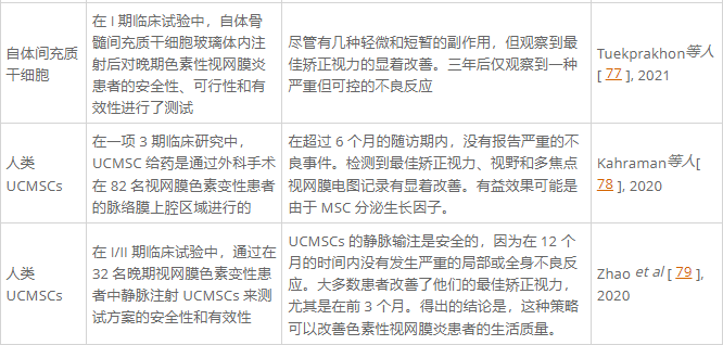 間充質(zhì)干細(xì)胞治療視網(wǎng)膜色素變性主要通過不同的機(jī)制改善視覺功能:MSC轉(zhuǎn)分化后的細(xì)胞替代、旁分泌作用或炎癥調(diào)節(jié)。此外,還可以改善視網(wǎng)膜電圖參數(shù)。表3總結(jié)了主要結(jié)果。