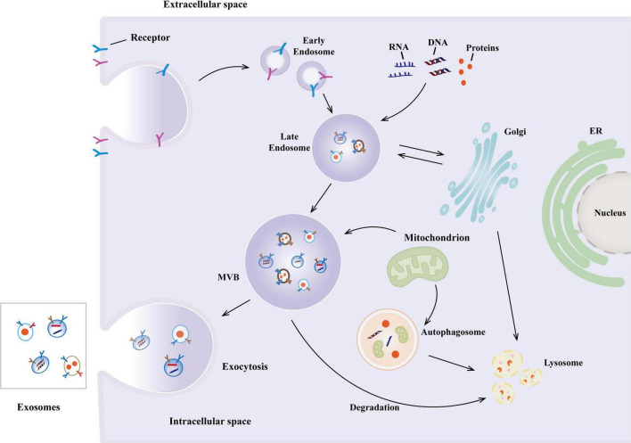 圖1:外泌體的生物合成。外泌體的生物合成始于細(xì)胞膜內(nèi)吞過程中早期內(nèi)體的形成,隨后成熟為多泡體 (MVB),并通過膜內(nèi)陷形成腔內(nèi)囊泡 (ILV)。MVB與質(zhì)膜融合后,ILV被釋放為外泌體。
