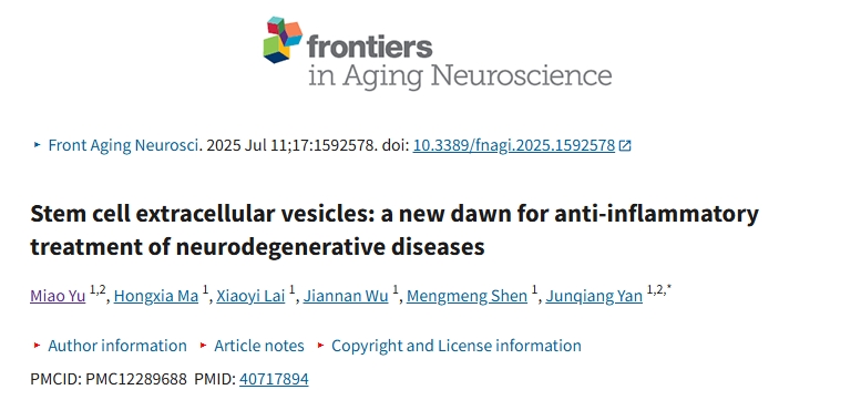 [1]:Yu M, Ma H, Lai X, Wu J, Shen M, Yan J. Stem cell extracellular vesicles: a new dawn for anti-inflammatory treatment of neurodegenerative diseases. Front Aging Neurosci. 2025 Jul 11;17:1592578. doi: 10.3389/fnagi.2025.1592578. PMID: 40717894; PMCID: PMC12289688.