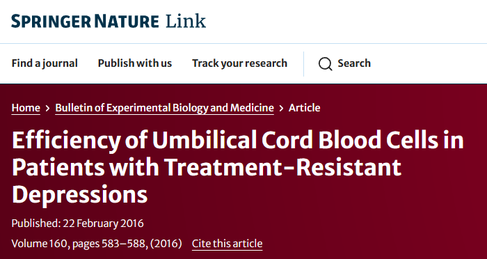 2016年,Smulevich等人進(jìn)行了一項值得注意的研究,他們研究了臍帶血細(xì)胞對難治性抑郁癥女性的治療潛力。參與者每周注射2.5億個濃縮臍帶血細(xì)胞,每四周一次。對照組接受安慰劑注射。雖然兩組的抑郁癥狀和低情境化癥狀均有所減輕,但治療組在難治性和抑郁嚴(yán)重程度方面顯示出延遲但更明顯的改善。此外,在干細(xì)胞治療組中還觀察到長期認(rèn)知改善。
