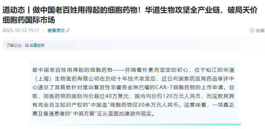 12月12日,我國華道(上海)生物醫(yī)藥有限公司向國家藥監(jiān)局藥品審評中心(CDE)遞交了首款自主研發(fā)的 CAR?T 細(xì)胞藥物上市申請,該藥物主要用于難治復(fù)發(fā)性非霍奇金淋巴瘤(r/r NHL)。這款產(chǎn)品完全自主創(chuàng)新,從核心原料到生產(chǎn)設(shè)備均實(shí)現(xiàn)國產(chǎn)化,打破了對進(jìn)口依賴。[5]