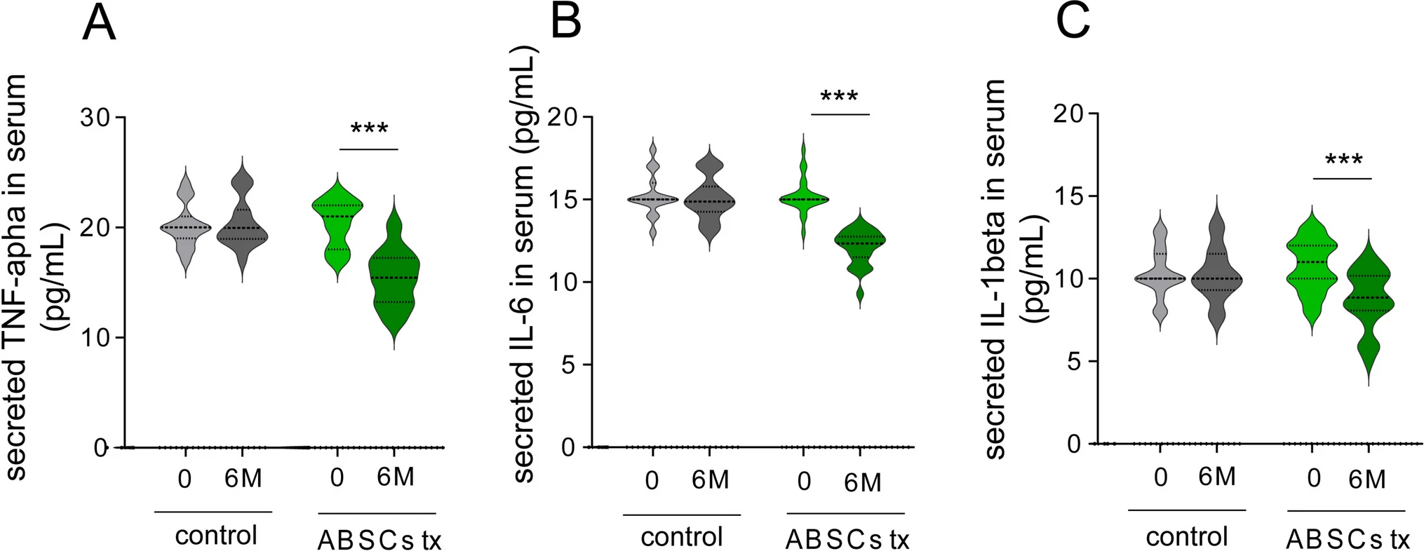 最后,治療發(fā)揮了強大的免疫調節(jié)與抗炎作用,為大腦創(chuàng)造了有利的修復環(huán)境。阿爾茨海默病腦中過度活化的神經炎癥會加速損傷。本研究顯示,治療后促炎細胞因子(如TNF-α、IL-6)水平顯著下降,同時活化星形膠質細胞的標志物GFAP也明顯減少。這表明干細胞療法有效抑制了有害的神經炎癥反應,減輕了炎癥對神經元的持續(xù)攻擊,從而間接保護了腦組織。