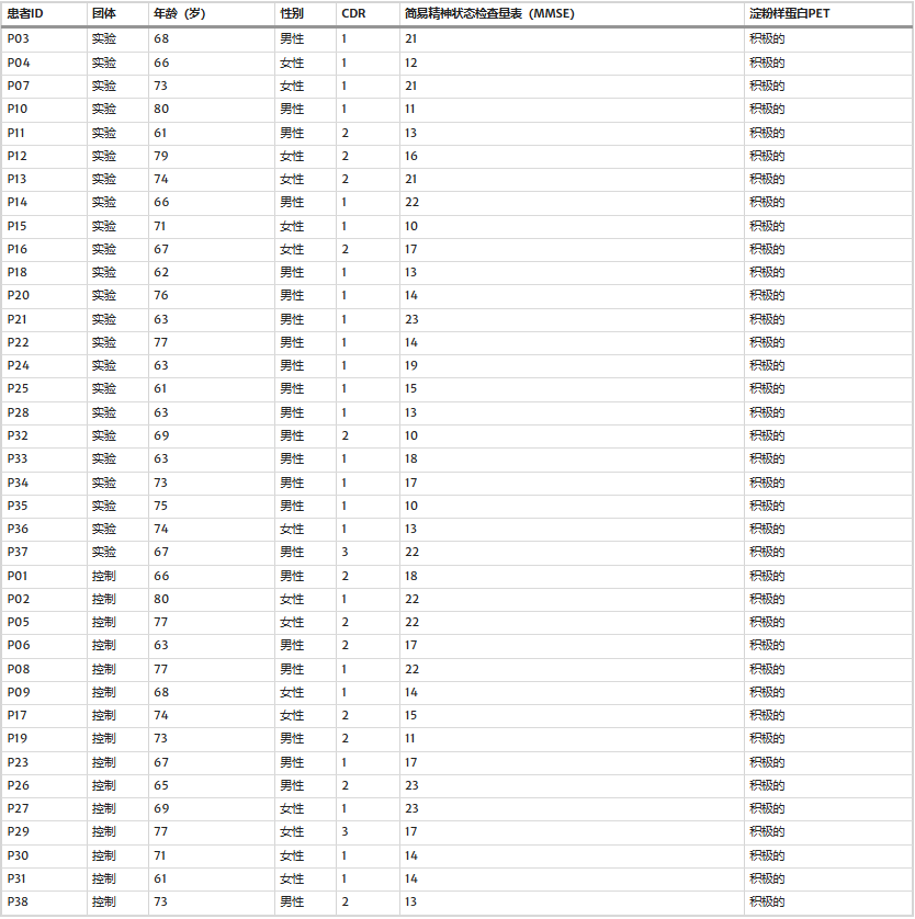 本研究共納入38例中重度AD患者,隨機分配至實驗組(23例,接受ABSCs聯(lián)合生長因子治療)和對照組(15例,接受標準藥物治療)。兩組受試者的基線特征具有可比性,在年齡、性別、疾病嚴重程度和認知評分方面均無顯著差異(表1)。平均年齡72.3歲,女性占比60%,以中度AD為主。