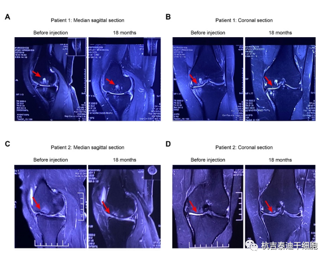 四十個膝蓋中的二十八個在注射前為RechtII級,十二個為RechtIII 級。注射后18個月,8例為RechtI級,22例為RechtII級,10例為 RechtIII級。Recht評分提高率為25%。在補充圖S1中,列舉了兩名患者在接受關節內注射MF-AT之前和之后的MRI結果。在冠狀面和矢狀面上,我們可以看到與應用MF-AT之前相比,膝關節水腫略有減輕,但軟骨再生不明顯。