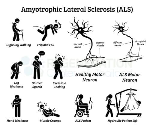 由于上、下運動神經元的快速變性,ALS等神經退行性疾病通常會導致肌肉萎縮、神經性疼痛、肌肉痙攣、頻繁肌肉痙攣等。 全身抽筋或痙攣。這些癥狀經常被誤認為是周圍神經病變等其他疾病,隨著時間的推移,ALS患者會失去控制自主運動、排便功能、呼吸衰竭以及負責眼球運動的眼外肌的使用能力。ALS不被認為是自身免疫性疾病的一個例子,盡管一些醫學研究人員認為它可能是,部分原因是看似雜亂無章的免疫反應和氧化應激。