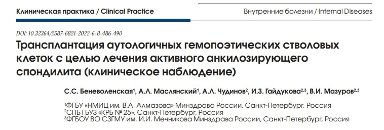 俄羅斯期刊《KAиниЧeckaanpakrka /Clinical Practice》近期發(fā)表了一項(xiàng)名為《自體造血干細(xì)胞移植治療活動(dòng)性強(qiáng)直性脊柱炎(臨床觀察)》的研究成果。重點(diǎn)介紹了干細(xì)胞移植治療重度強(qiáng)直性脊柱炎患者的7年臨床觀察的結(jié)果。[8]