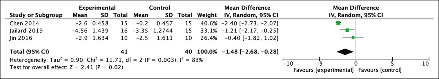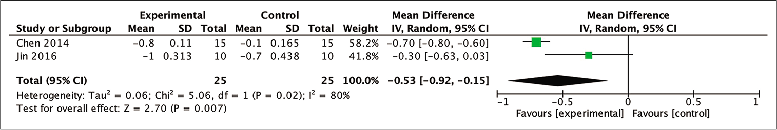 干細胞治療組的平均差異在統計學上更大,盡管這一結果沒有統計學意義(MD = -0.27;95% CI -0.52–0.17;P = 0.33;I 2 = 93%)。