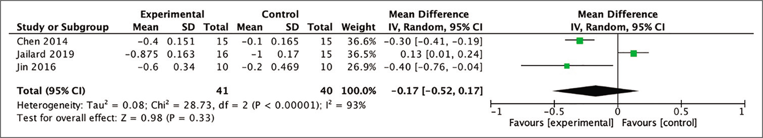 干細胞治療組的平均差異在統計學上更大,盡管這一結果沒有統計學意義(MD = -0.27;95% CI -0.52–0.17;P = 0.33;I2=93%)。