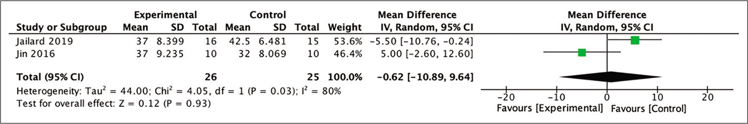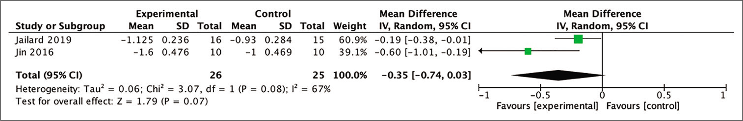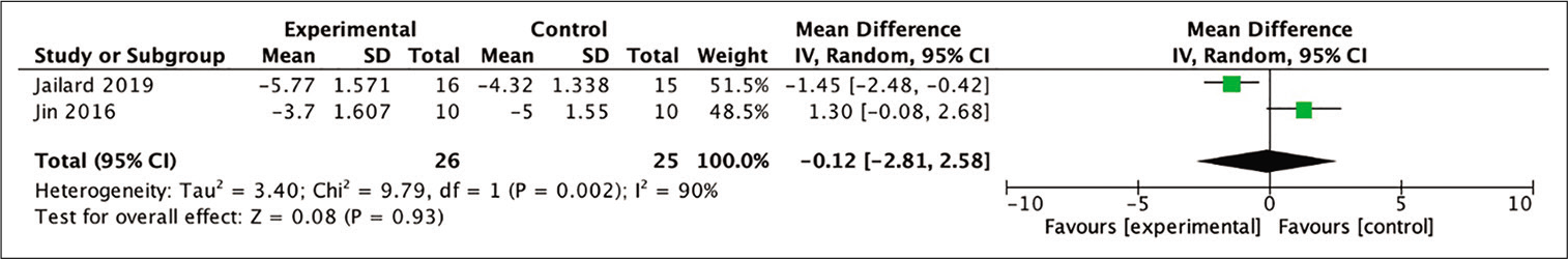 薈萃分析中包含的四項研究中有兩項能夠通過計算基線和治療后12個月mRS評分之間的平均差來分析以確定mRS評分的改善情況。從這兩項研究中,對干細胞治療組和對照組之間第12個月mRS評分平均差異的薈萃分析表明,接受干細胞治療的組在統計學上有更有利的趨勢。該結果顯示在[圖8]。
