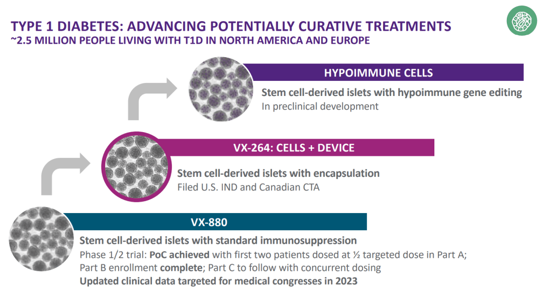 Vertex正在采用多種研究方法,使用干細胞衍生的胰島,以取代T1D患者體內破壞的產生胰島素的胰島細胞。Vertex在T1D的第一個臨床研究項目VX-880是一種干細胞衍生的、完全分化的、產生胰島素的胰島細胞替代療法,與免疫抑制結合使用。Vertex已在VX-880項目中證明了概念的臨床證明,美國和加拿大正在進行1/2期臨床研究。