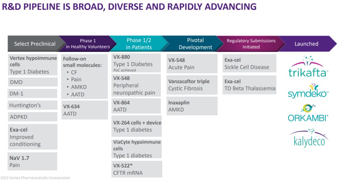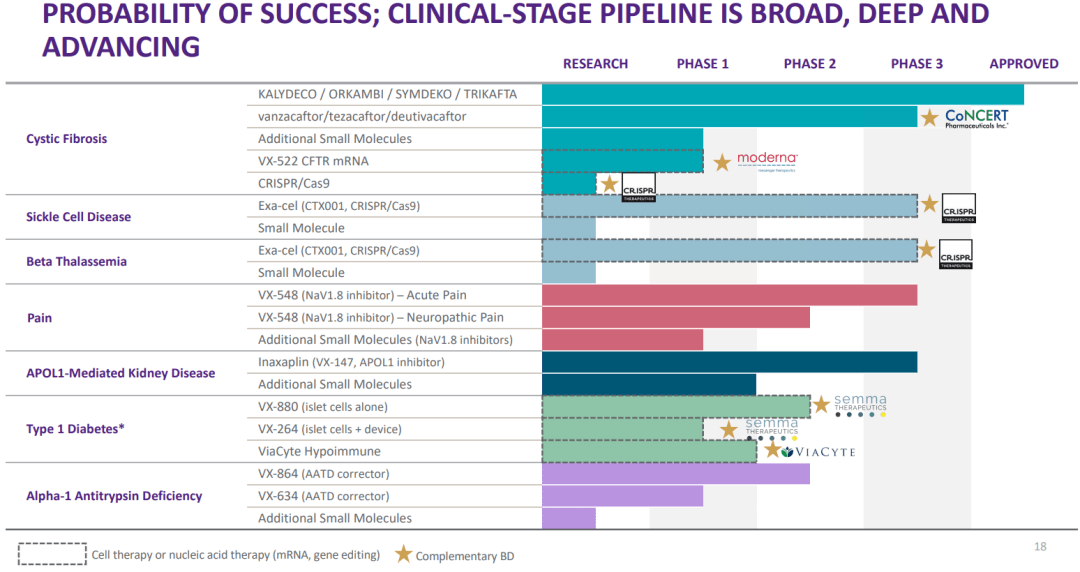 目前,Vertex除了1型糖尿病等自身免疫疾病產品外,其適應癥覆蓋甚廣,在杜氏肌營養不良癥(DMD)、肺囊性纖維化(CF)以及肺部和肝臟疾病等領域均有布局。而Vertex與CRISPR合作的全球首款CRISPR基因編輯療法exa-cel已經上市在即,Vertex近期引起了不少關注,其最近動態也不可謂不頻繁。在3月1日,Vertex還與ImmunoGen達成了一項全球多目標許可和期權協議,ImmunoGen授予Vertex使用其ADC技術進行研究的權利,以發現用于基因編輯的新型靶向調節劑。結合近期的動態來看,Vertex在完善CRISPR基因療法領域的布局的同時,似乎也在嘗試進軍其他領域,管線廣泛覆蓋了基因療法、mRNA、tRNA甚至是ADC藥物。