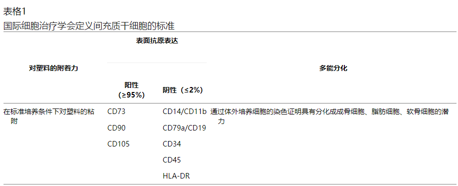間充質(zhì)干細胞可以分化為中胚層或外胚層細胞,從而產(chǎn)生貼壁的多能成纖維細胞型干細胞。不同的研究人員以不同的方式定義MSC特征。為了解決這個問題,國際細胞治療學(xué)會推薦了一組三個標(biāo)準(zhǔn)來定義人類間充質(zhì)干細胞:粘附性、特異性表面抗原表達和多能分化潛能(表1)。
