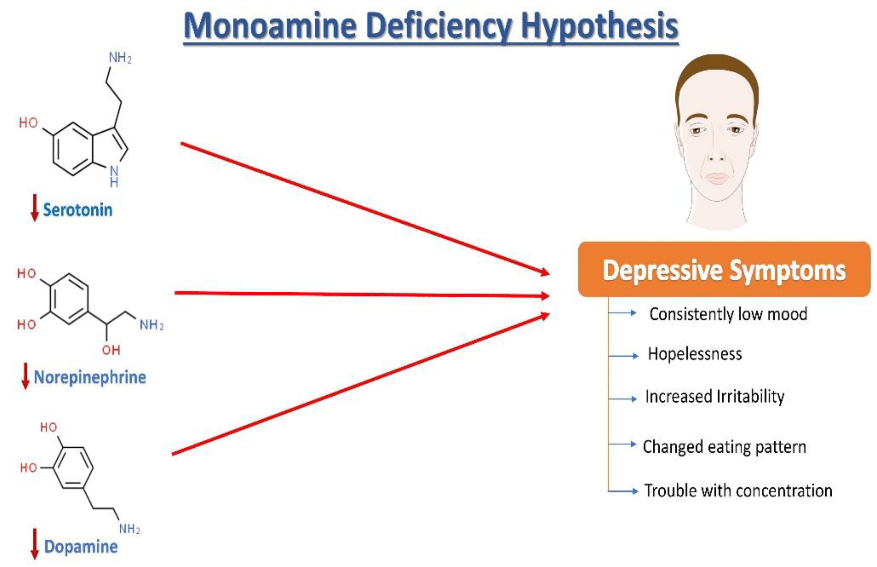 已觀察到血清素、去甲腎上腺素和多巴胺水平降低,并被認為是導致抑郁癥狀產生的主要因素之一。