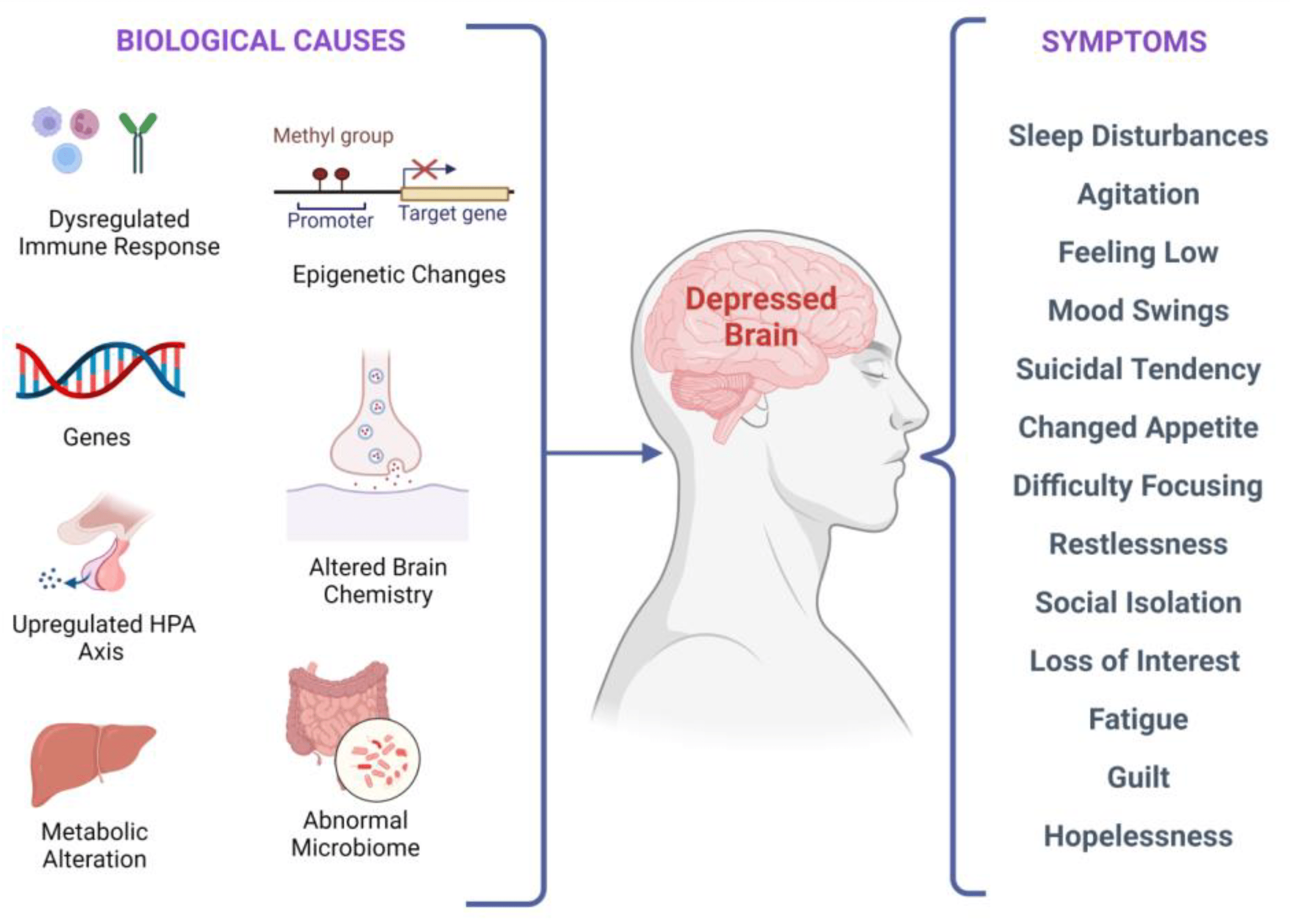 在分子、遺傳、表觀遺傳、細胞和系統水平上有多種生物學原因。這些原因會導致臨床抑郁癥,并且可能會出現多種癥狀,這些癥狀可能因人而異。