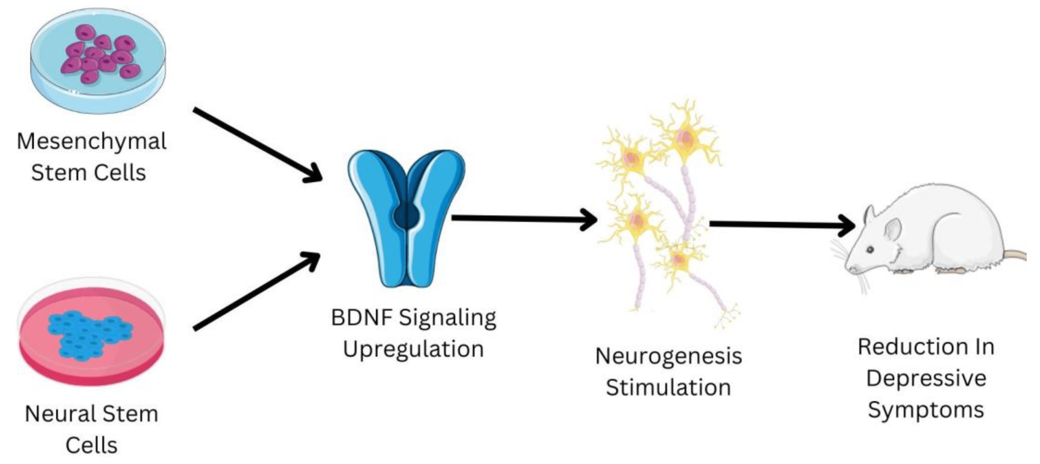 由于施用MSCs和NSCs,已經觀察到小鼠動物模型中抑郁癥狀的減輕。MSCs和NSCs具有上調BDNF信號通路的能力,而BDNF信號通路通常在患有抑郁癥的患者中被下調。BDNF信號通路的上調有助于刺激神經發生。神經發生是導致抑郁癥發展的主要生物學因素之一。神經發生的增加有助于緩解與抑郁癥相關的癥狀。