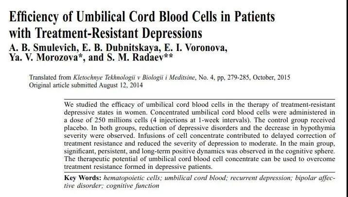 2014年,俄羅斯科學家使用臍帶血治療13名復發難治性抑郁癥患者,結果發現臍帶血有助于難治性抑郁癥的治療,特別是認知-情感亞量表的改善。