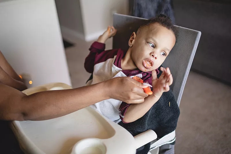 插圖:腦癱的非裔美國男孩在享受小吃時間