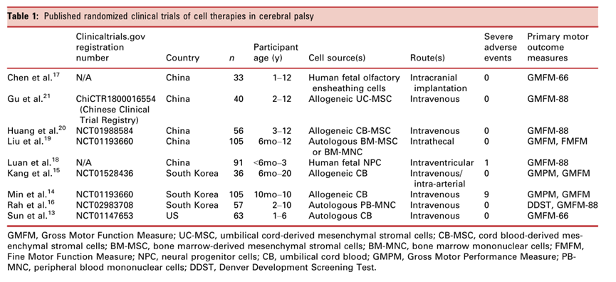 [1]Sun JM, Kurtzberg J. Stem cell therapies in cerebral palsy and autism spectrum disorder. Dev Med Child Neurol. 2021 May;63(5):503-510. doi: 10.1111/dmcn.14789. Epub 2021 Jan 4. PMID: 33398874.