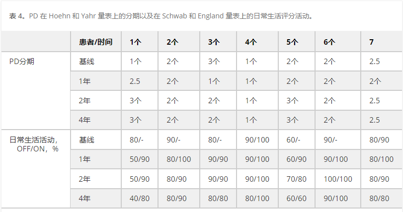 在他們的1年、2年和4年評估中,患者在Hoehn&Yahr量表(表4)上的分期以及在Schwab和England量表上的評級(表4)僅顯示出微小的變化,除了P1,誰的分數(shù)明顯變差了。