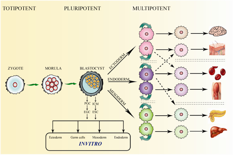 干細胞被認為是細胞的組成部分。體內所有特化細胞都來自干細胞。當干細胞分裂時,它們要么產生更多的干細胞,稱為子細胞,要么分化成專門的細胞,如骨骼、血液或腦細胞。