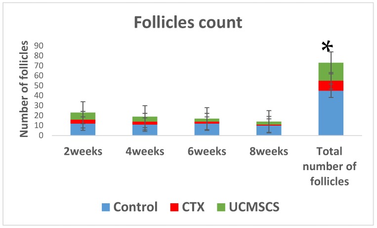 但總的來說,臍帶血間充質干細胞 (UCMSCs) 中的卵泡計數) 綠色組在CTX組中顯著增加 (* p<0.05)。
