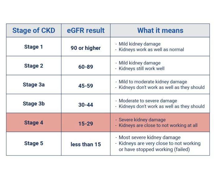 第4階段CKD意味著您的eGFR介于15至29之間,并且腎臟受到中度至重度損害。您的腎臟無法正常工作,無法過濾血液中的廢物。這些廢物會(huì)在您的體內(nèi)積聚并導(dǎo)致其他健康問題,例如高血壓、骨骼疾病和心臟病。您可能會(huì)出現(xiàn)手腳腫脹和腰部疼痛等癥狀。