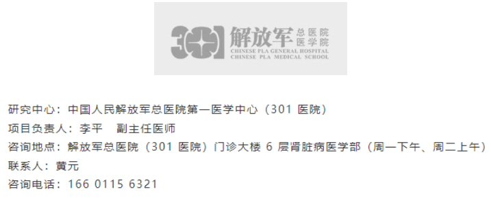 符合上述標準且有意參與的患者,請盡快與解放軍總醫院第一醫學中心腎臟病醫學部聯系,詳細了解報名及治療過程,抓住這一難得的治療機會!