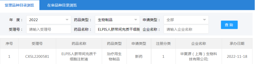 2022年11月18日,華夏源(上海)生物科技有限公司“ELPIS人臍帶間充質干細胞注射液”的藥物臨床試驗申請獲受理(受理號:CXSL2200581)。這是自2021年7月30日起,華夏源“ELPIS人臍帶間充質干細胞注射液”的第3種適應證申請獲得受理。此前,該干細胞注射液已獲得默示許可用于中/重度慢性斑塊型銀屑病(受理號:CXSL2101224)、重度狼瘡性腎炎(受理號:CXSL2200142)的臨床試驗。